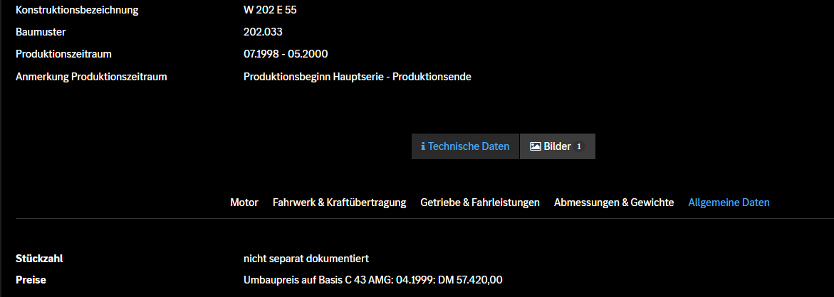 Ich gehe davon aus, dass es noch weitere offizielle C 55 AMG Umbauten gibt, jedoch lassen sich diese nicht mit Hilfe der Datenbank für die Datenkarten feststellen. Peace!