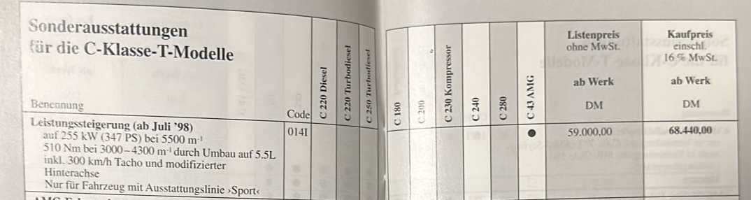 Ich bin jedoch noch auf ein paar Autos gestoßen, die vom C43 abweichen. In wie fern dies ein C 55 Werksumbau belegt, lässt sich nicht zu 100% verifizieren: